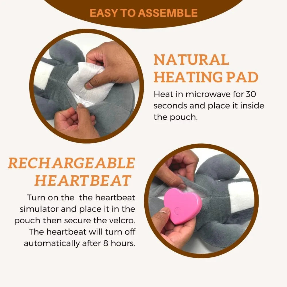 - SCIENCE BEHIND OUR TOY: Our SMART heartbeat puppy module is made to be long lasting. Once you turn on the heartbeat, it will run for 8 hours and TURN OFF AUTOMATICALLY. This puppy sleeping buddy will release warmth and have a real heartbeat simulation which will relieve your pets anxiety and irritation. INCLUDES: 1 chew bone, 1 puppy chew teething pacifier, 1 reusable heating pad, 1 rechargeable heartbeat module, 1 charging cable